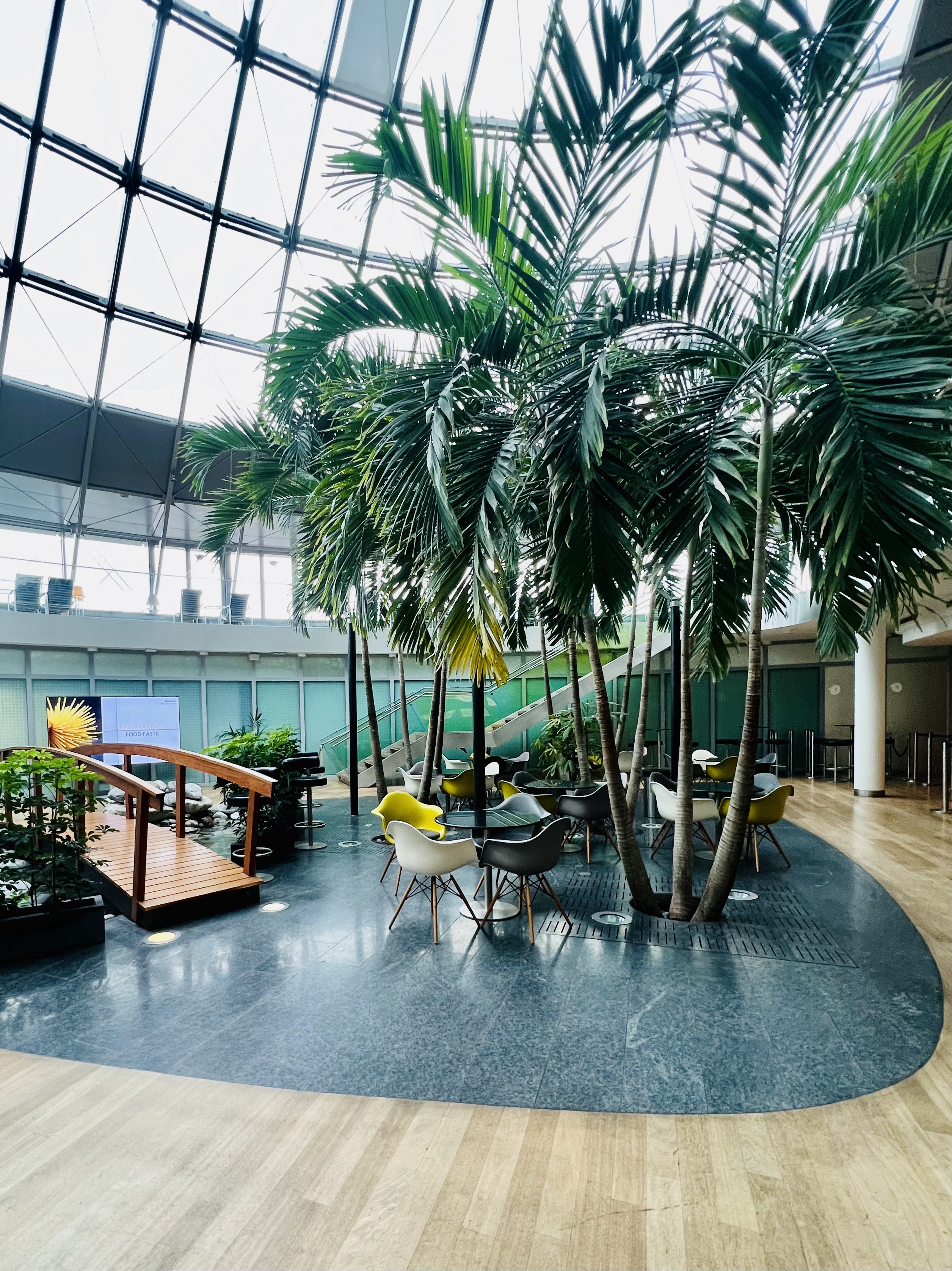 Très joli lounge avec beaucoup de verdure. La vue est top pour celles et ceux qui veulent un peu de calme ou se restaurer avant de prendre leur vol. Par contre niveau nourriture je trouve le choix limité il manque le fromage à mon goût 🙃