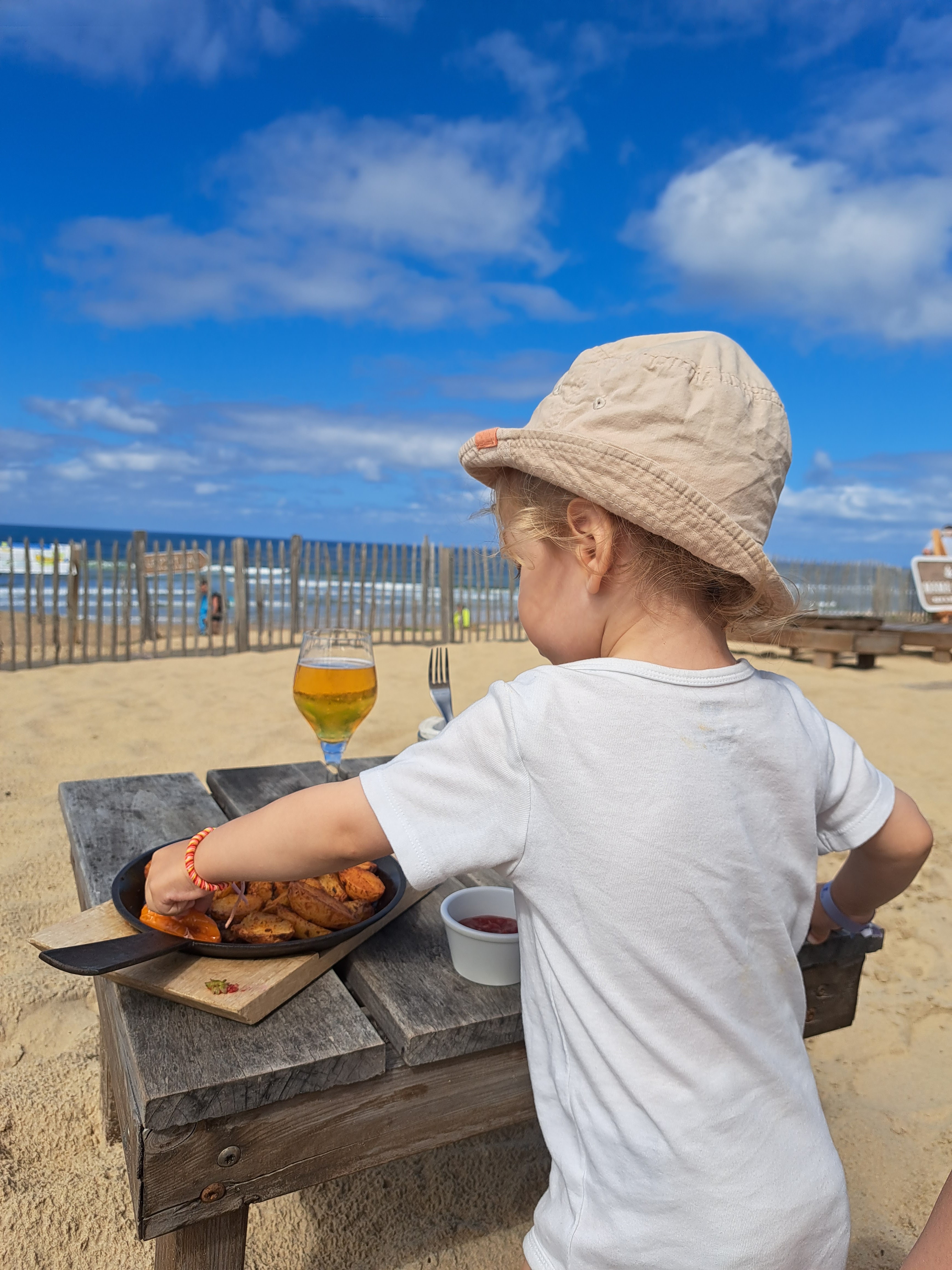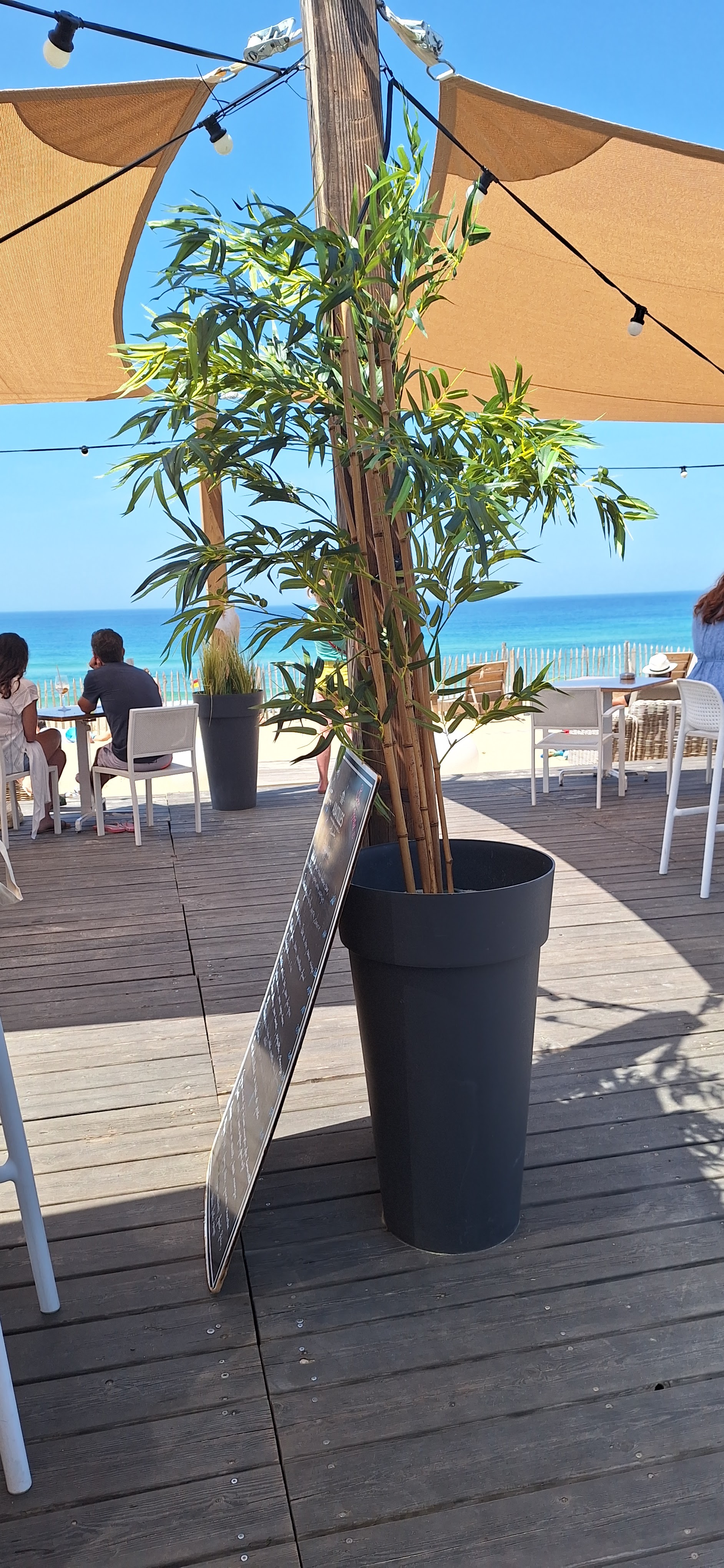 Nous y sommes allés 2 fois , pour y déjeuner un dimanche midi et pour un goûter gourmand un mardi vers 17h. A chaque fois service impeccable (rapide et souriant), excellent produit ( fruits de mers top, boissons bio, glace artisanale..), très bonne ambiance (concert rockabilly le mardi !) et tout cela sur site au top (une partie couverte a l ombre, un partie terrasse en bois avec voilage et un partie transat sur le sable) je recommande vivement cette adresse. Traif un peu élevé mais coherent avec le lieu et la qualité (un trentaine d euros par pers pour le repas et 13euros par pers pour le goûter)