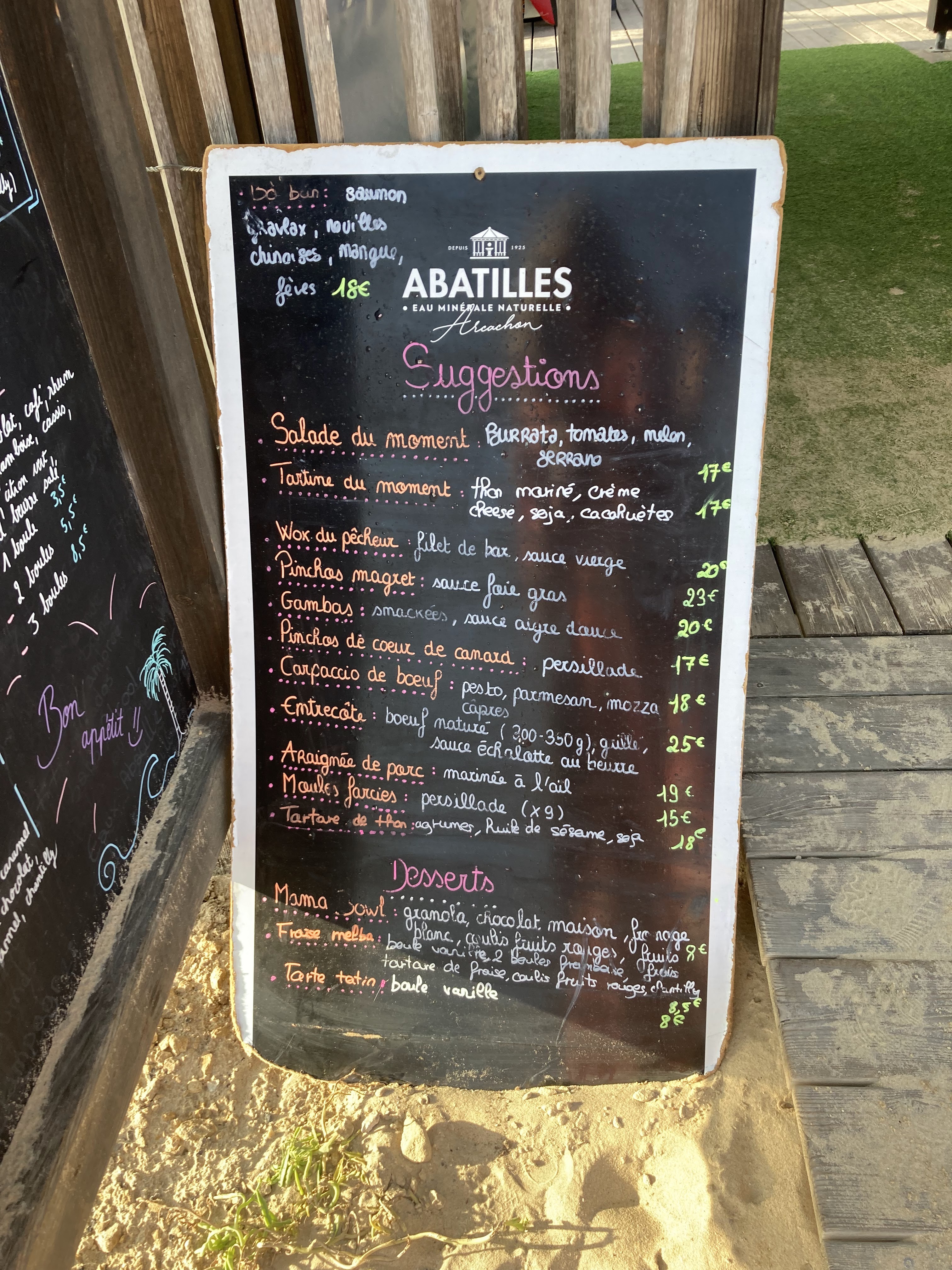 Cadre magnifique les pieds dans le sable. Tres bon service. Belle présentation et plats très bons Nous avons choisi un tartare mais malheureusement pas de frites proposées cette année.